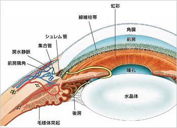 房水は毛様体というところで作られ、水晶体の前側、瞳孔を通り、隅角にあるシュレム管という排水管に流れていきます。